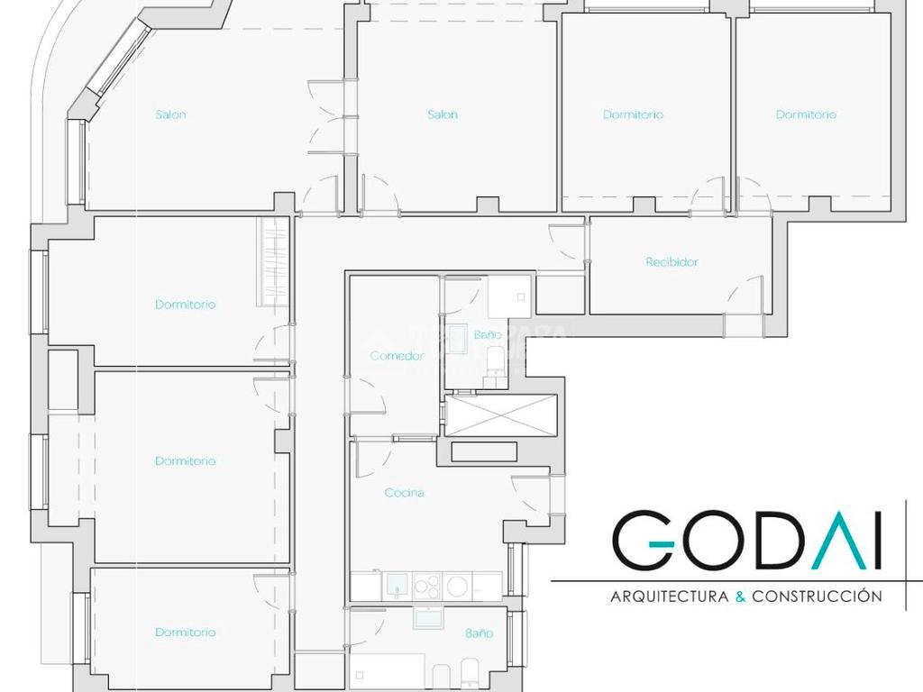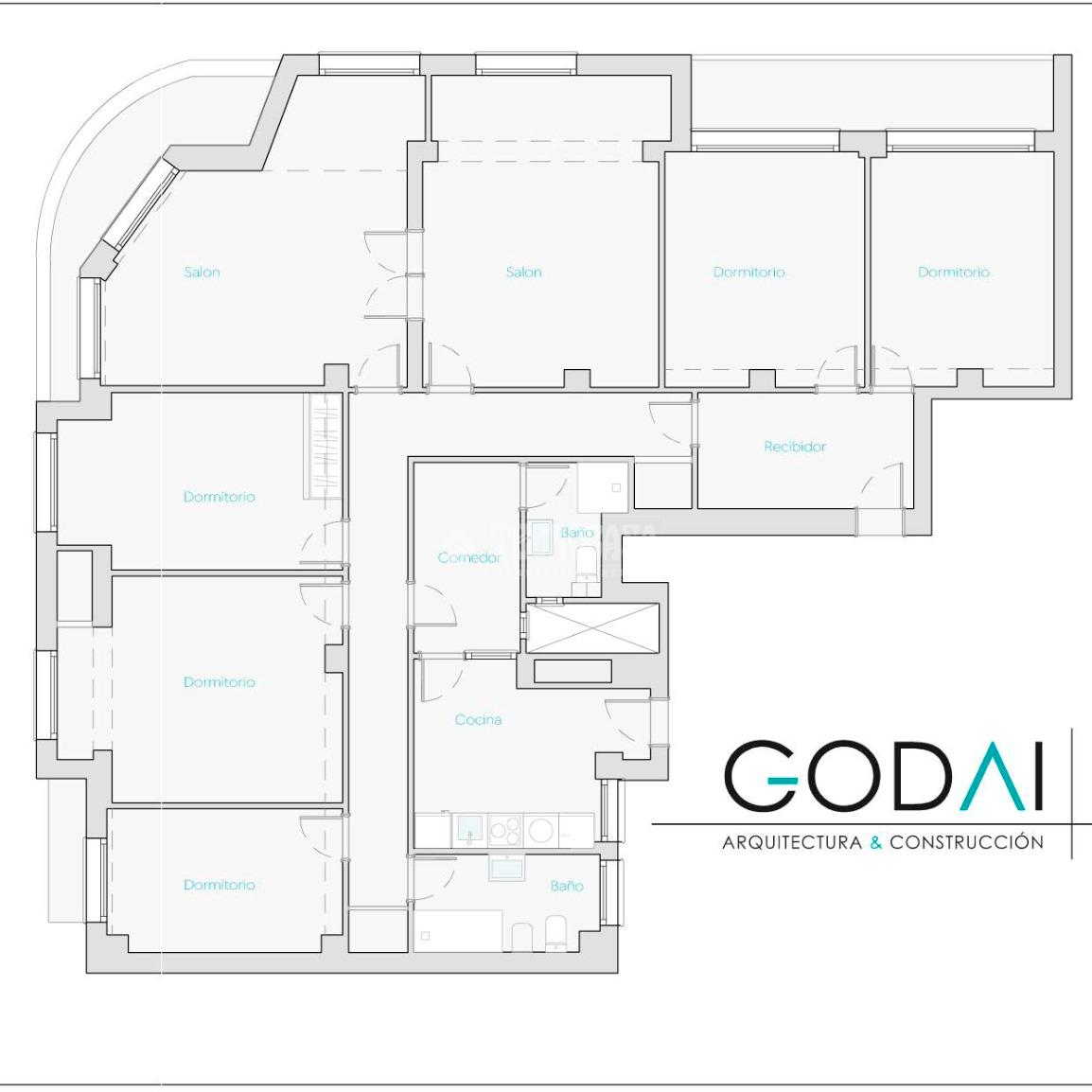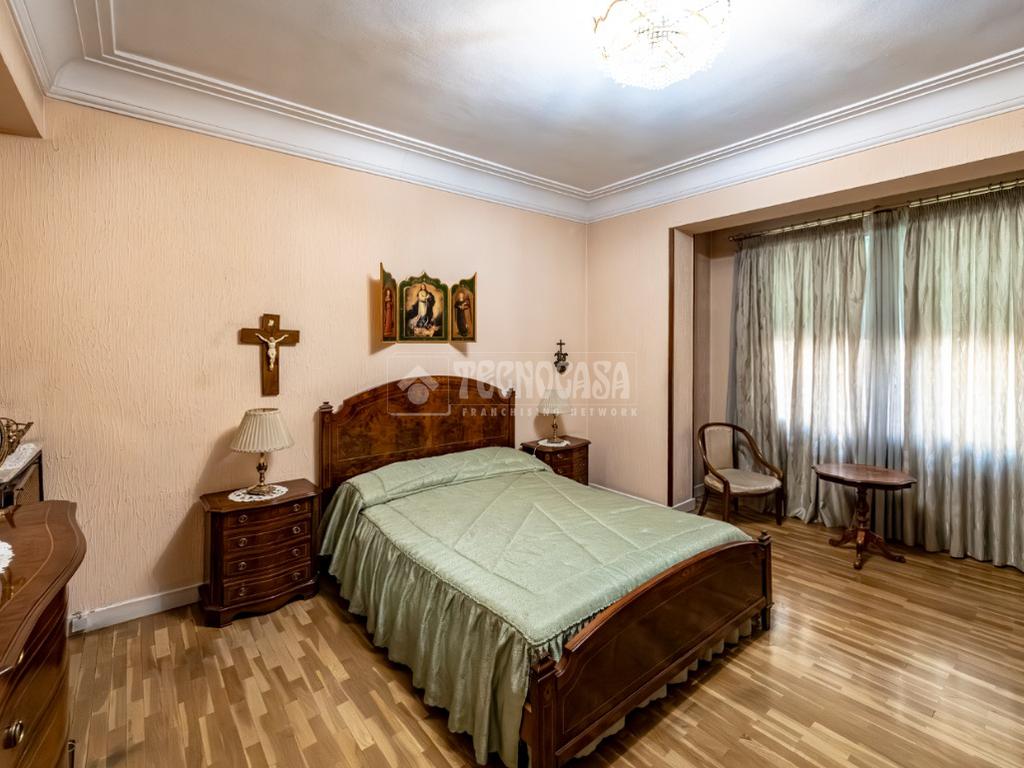 La distribución actual se compone de un recibidor, cinco dormitorios de generosas dimensiones —dos de ellos con acceso directo a dos terrazas y todos exteriores—, un luminoso salón doble con salida a la tercera terraza en esquina, cocina independiente con office y dos cuartos de baño completos. Tiene dos puertas de acceso, principal y de servicio.